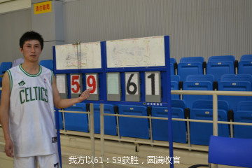 第四节我方的身高和体力优势逐渐明显,加上熟悉之后重点盯防了对方的24号和27号明星球员,内线马珂和曹孝金的强势进攻,板爷邱建勇的篮板争抢,打出了血性男儿本色。最后3分钟时,我方终于扳平了比分,此后比分一直保持平局,最后20秒时,马珂投中2分,我方以61:59,领先1个球。此时对方24号快速发动进攻,3分线外抢投3分,意图反超绝杀。可惜球没有投进,而篮板再次被我方牢牢抓住,最终1球优势有惊无险的取得了比赛的胜利,为公司争得了荣誉。赛后双方球员友好的交谈,增进了了解,并相约改日再战。