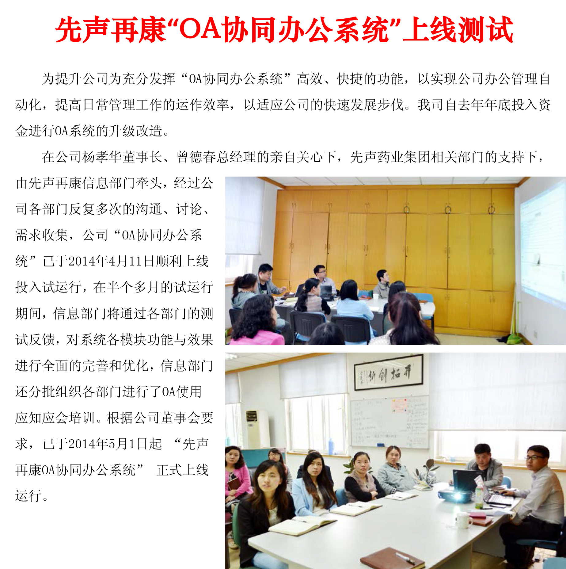 先声再康“OA协同办公系统”上线测试