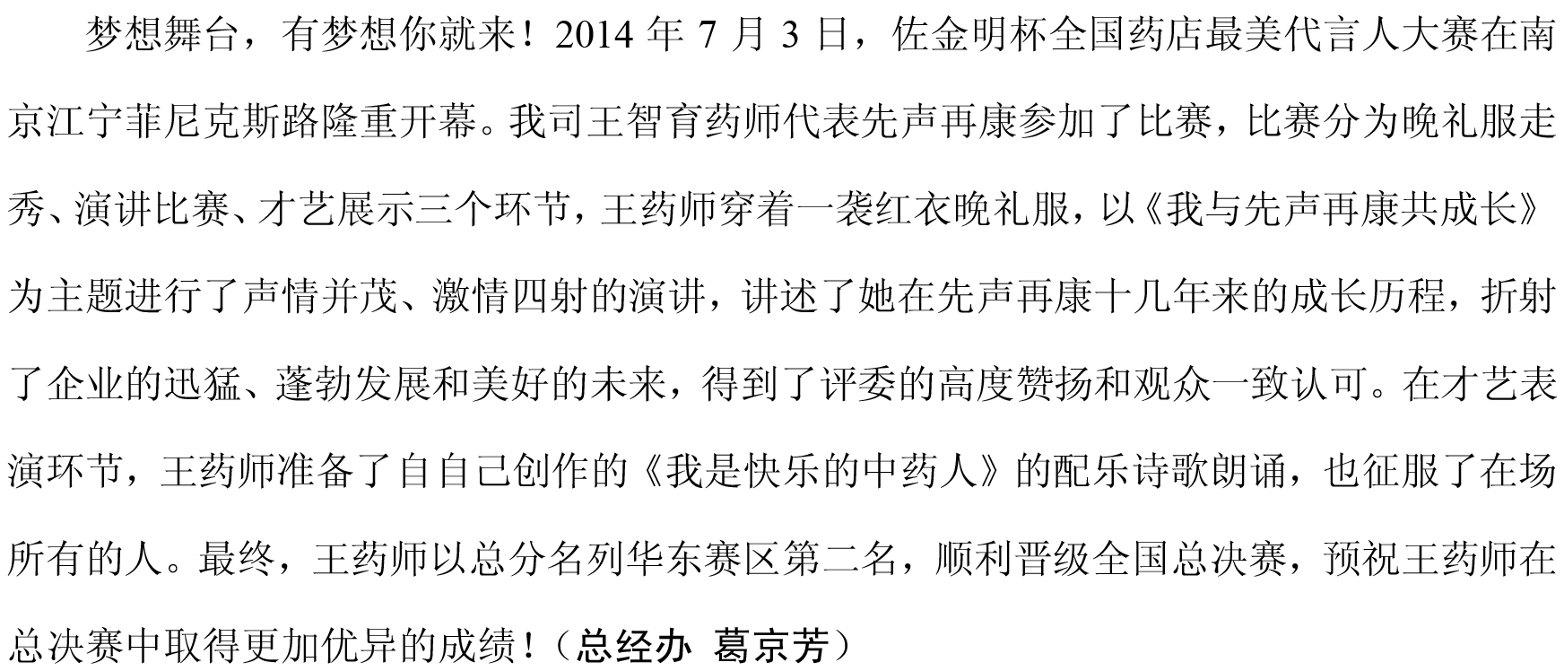 热烈祝贺我司后宰门药店王智育药师获佐金明杯全国药店最美代言人华东赛区第二名