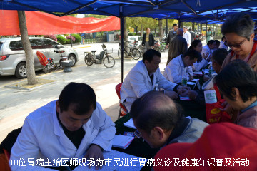 10位胃病主治医师现场为市民进行胃病义诊及健康知识普及活动。工作人员为到场市民免费发放健康教育宣传手册。参加联合义诊的专家建议,爱护我们的胃,选择健康的饮食方式是非常必要的。为了减少胃病的发生率,饮食定时定量,生活要有规律,早餐尤为重要;在日常生活中,注意多释放压力,多参与户外活动。不要因工作忙、减肥或睡懒觉而不吃早餐。治疗胃病要脾胃同治,同时要正确选择药物。一旦发现胃部不适、胃痛、长期胃胀等情况时一定要到正规医院就诊。及早发现、及早预防、及早治疗是杜绝胃病的最佳手段。
